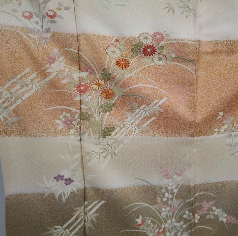 ベージュの地に、熨斗目に竹と花が描かれた訪問着です。
